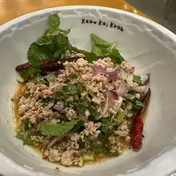 Spicy Duck Larb: A bold and flavorful minced duck salad mixed with crispy fried chicken skin, served with fresh vegetables, perfect for those who love intense flavors.