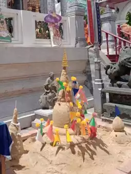 ✨️The temple invites the sacred Buddha image in front of the chapel for people to bathe the Buddha image, build a sand pagoda, and provide alms for 4 days.