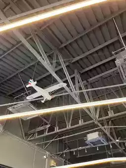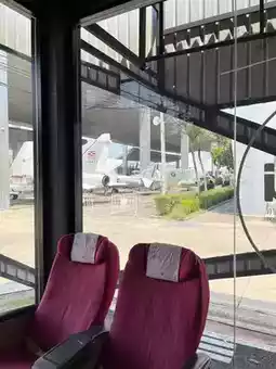 The cafe is hidden in the Air Force Museum. It is a small coffee shop decorated in black tones, cool, you can see the planes, decorated with chairs like on the planes, cool air conditioning, delicious coffee, good reception staff, smiling, lots of parking, there are seats both inside and outside.