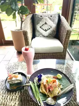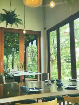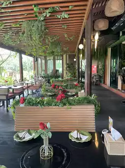 Review: We stayed at a hotel near the airport and saw a cafe near Suvarnabhumi Airport so we decided to give it a try. It's a beautiful cafe with delicious food and lots of places to take pictures. What we liked was that the shop was decorated so cutely. There were flowers on every table and lots of corners for taking pictures. There were both tables inside and outside. The prices of the food weren't too high. Drinks start at 100 baht and cakes start at 100฿, but we liked the sugar palm cake - it was delicious. Food starts at 150฿. Most of the food is Thai food.