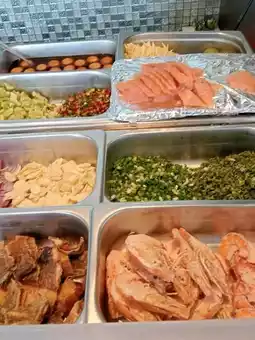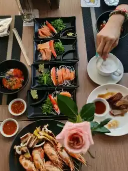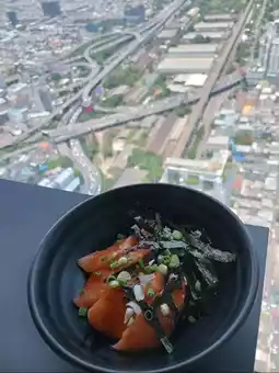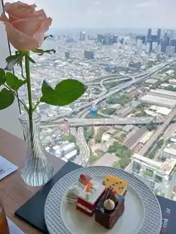 The international buffet at Baiyoke Sky Hotel, 82nd floor, offers a variety of dishes including grilled seafood like shrimp, squid, and shellfish, Japanese cuisine such as sashimi, roasted duck, Chinese dishes, dim sum, and both ready-to-serve buffet items and freshly prepared hot dishes. Desserts, tea, and coffee are also available. The food is flavorful and diverse, and you can enjoy stunning views of Bangkok from the 77th and 84th floors for free, making it a great value.