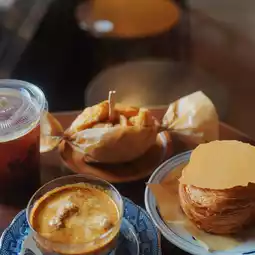 Coffee Roasting Shop Songwad, a famous coffee shop in Songwad Road, is a meeting point for many people. The new location is near the Pei Ying Chinese Language School, on Rong Kom Alley. The shop is not far from the original location. What's more, there are more seating areas and space. The interior is decorated in a classic Chinese style. There are both air-conditioned seating areas and outdoor seating areas. It feels good. Being in an alley makes the mood feel like being in an old Chinese community. This is the charm of this place. The shop's menu still emphasizes good quality coffee that the shop roasts itself. There are many beans to choose from. The medium roast Americano tastes good and has a fragrant coffee aroma. The dirty is very smooth milk. And what you can't miss is the egg pastry and crispy croissant. It's perfect with coffee. You can sit and sip coffee with a classic atmosphere. It helps you feel much more relaxed. I recommend this as another shop in this area. You should definitely stop by and try it once.