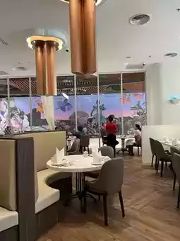 The restaurant is decorated luxuriously in a soothing white tone. The seating is private. Some tables have space for each seat. The food tastes good and is delicious. They use fresh ingredients. The staff provides good service at a hotel level.