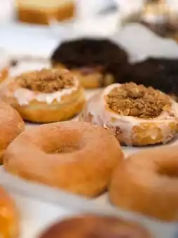 Here, there are 9-12 donut flavors to choose from, rotating every day. Our favorite is