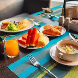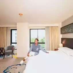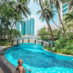 A chill atmosphere with a complete restaurant, fitness center, and swimming pool.