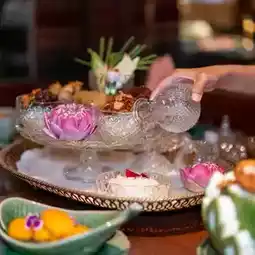 For dinner, we went to Thara Thong restaurant. The restaurant is very beautiful. It is in a true Thai style. It is on the river. There is a seating area both inside and outside. Currently, there is a promotion for Khao Chae. A collection of Khao Chae menus from 14 hotels in the Marriott Bonvoy group, only 488+ baht per set