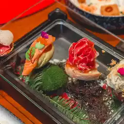 โข ๐๐๐๐ง๐๐ ๐๐๐จ๐ (Iberico fish): Smoked Hamachi fish Tomato tartare, mentaiko, crispy tartare and wasabi foam