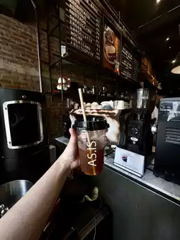 As.is Coffee Stand is a small cafe located in the old city of Bangkok. The atmosphere is warm, loft style, and the exposed brick walls give a cool and unique feel. The front of the shop is decorated with lush green trees and a shop sign in Thai and English that catches the eye.