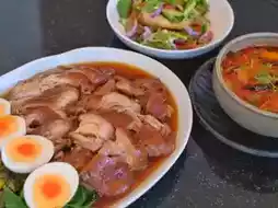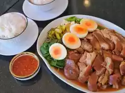 🐷 Krua Luang Pork Leg Rice Set (490 baht): Very large pork leg, meat, skin, eggs, full options, large plate, served with 2 cups of rice and spicy sauce
