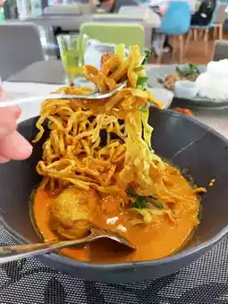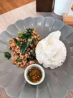 🍜 The waiter poured the hot and spicy curry on the crispy noodles. The noodles fully absorbed the curry flavor and the delicious taste left me with an endless aftertaste. In addition, I also tasted a bowl of Thai pork egg rice, but unexpectedly found that the egg rice here is different from the sunny-side-up eggs we are familiar with. Instead, it is served with boiled eggs, which is unique.