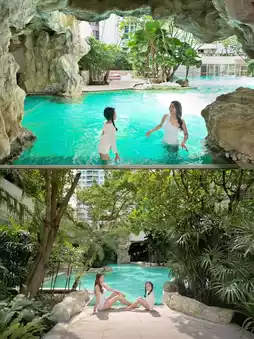 🔸Another highlight here is the unique lagoon pool with a beautiful waterfall curtain and green trees surrounding the pool. It feels like playing in a waterfall cave. You can play for a long time without worrying about the heat.