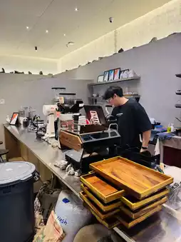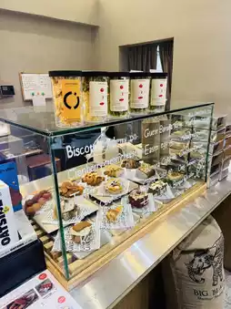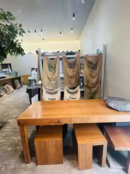 You can sit for a long time. The coffee beans are roasted in the shop, giving a very fragrant smell.