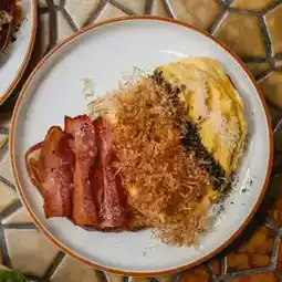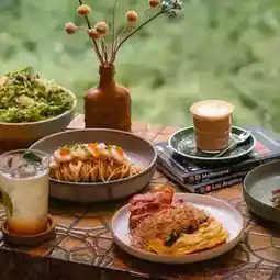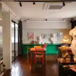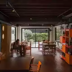 Brown Burgundy, a super chic cafe and wine bar in the Rama 9 area that you shouldn't miss! This shop is located in Soi Rama 9, Soi 29, by renovating a two-story old house into a mid-century-style cafe with a warm and friendly atmosphere. The shop is decorated with artwork and vintage furniture that fits perfectly. There are both indoor and outdoor areas that are shady, perfect for chilling out or taking beautiful photos.
