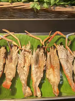 🦐 Fresh seafood: Grilled river prawns, giant crab legs, lobster with seafood sauce and cocktail sauce