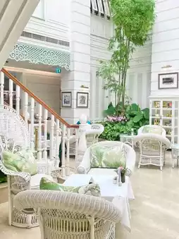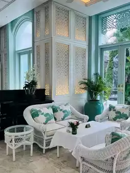 Bathed in natural light, the lounge is decked in pure white with soft green plants, lacy curtains, and vintage charm. It feels like a scene from a classic novel or a graceful afternoon in colonial Asia.
