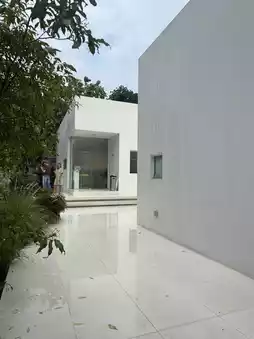 The shop is decorated in a minimalist style, white and gray tones, with both indoor and outdoor areas that are spacious, with a beautiful garden and a small pond, giving a sense of peace and relaxation.
