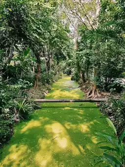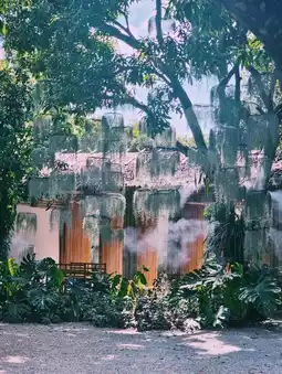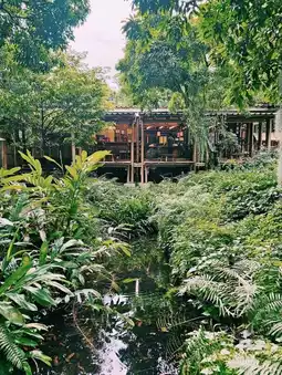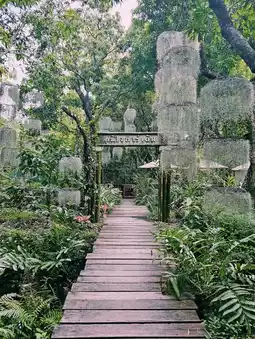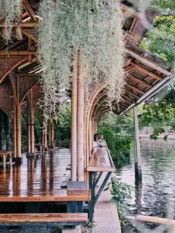 A cozy cafe near Bangkok in the Rama 2 area, surrounded by a lush garden (formerly a lychee orchard). Perfect for nature lovers who enjoy a serene and cool atmosphere. The cafe is divided into two zones: a restaurant located in the middle of the garden and a cafe by the water. Both zones feature bamboo materials in their design, creating a pleasant, shaded, and beautiful ambiance—ideal for relaxing.