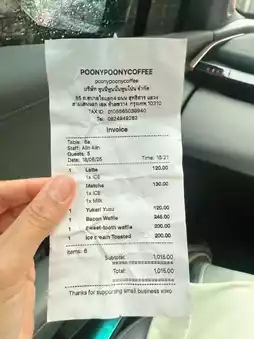 Poonypoonycoffee is located in Soi Sabai Jai 4, nestled inside the alley near Sutthisan. This time, we visited as a group of three and ordered a variety of food and drinks. The café is charmingly decorated in a Japanese-inspired style. The owner, who is also the barista, previously worked at a café in Melbourne, so the coffee quality is guaranteed. Each of us ordered a drink, and overall, the flavors were excellent and rich, especially the latte, which was incredibly delicious. For desserts, we tried the ice cream toast and bacon waffle, and everything was absolutely tasty. The presentation was also very appealing. The prices are reasonable, as shown on the bill, and are standard for a café in the city center. This café offers a cozy atmosphere, perfect for chatting with friends. Please note that the café is closed every Thursday.