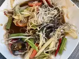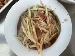 • Spicy papaya salad with fermented fish sauce, the fermented fish sauce is homemade and so delicious you can drink it with a straw