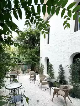 #BangkokShoppingGuide A garden cafe hidden in the old city of Bangkok, a small white building surrounded by green willows, away from the bustling city center, hidden in the alley, specializing in coffee and Western food