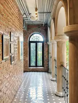 The European-style round arch on the second floor, the paintings of different styles on the wall, the ancient European-style open-air balcony, and the beautiful lighting really make it a great photo.