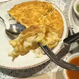 A typical Thai omelet with a moist inside and slightly crispy outside. It has a good flavor even without any other ingredients, and it goes really well with rice. It was simple but had a high level of perfection.