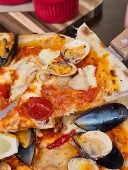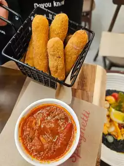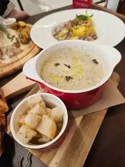 ✨ Pane da antipasto Bread served with olive oil and black pepper for extra deliciousness ✨ Deep-Fried Mozzarella Sticks (฿240) Stretchy cheese, crispy on the outside, soft on the inside! ✨ Truffle and Mushroom Soup (฿280) Fragrant truffle mushroom soup, smooth texture, soaked in cheese! ✨ Tagliatelle Sausage and Mushrooms (฿340) Flat pasta in a special cream sauce ✨ Squid Ink Risotto (฿390) Black squid ink risotto with a strong seafood aroma ✨ Grilled Pork Chop with Smoked Scamorza (฿380) Grilled pork chop with melt-in-your-mouth scamorza cheese ✨ Seafood Pizza (฿390) Fresh seafood pizza with thin and crispy dough