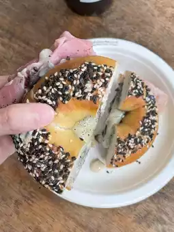 🫶🏻🥯 A famous bagel shop in the Sathorn area, the store is decorated in a retro black tone, creating a very cozy atmosphere. Outside, there's a Coffee Stand corner with a cool Japanese vibe. On our visit, we ordered the Salmon Cream Cheese Bagel, which was delicious with its chewy texture. We also added bacon, egg, and double cheese 🧀. Eating everything together was a burst of flavor!