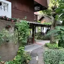 The site consists of three wooden houses, surrounded by lush trees and flowers, illustrating Bangkok’s history in the 1950s and 60s: 🌳🌸