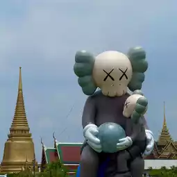 KAWS:HOLIDAY THAILAND transforms Sanam Luang into a spectacular outdoor gallery! 🌟 Located in the heart of the city next to Wat Phra Kaew, the atmosphere blends the grandeur of Thai history with contemporary art. The event is held in an open space, attracting people of all ages who come to admire and take photos enthusiastically 📸. It can be a bit hot during the day, so it’s recommended to visit in the morning or evening for a more relaxed experience 😎.