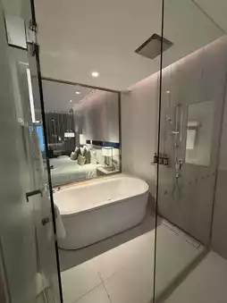 The guest rooms were clean, featuring a unique design where you can watch TV from the bathroom with a bathtub. The amenities were from Panpuri, and everything necessary was provided, allowing for a comfortable stay.