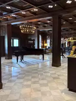 The hotel itself has an old England vibes and feels like an 1930’s London inside, there is dark wood throughout and iconic green glass lampshades. The foyer has amazing leather sofas, a grand piano and beautiful lighting.