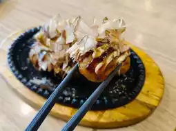 🐙 Fried Takoyaki – filled with whole octopus, topped with rich sauce and fragrant dried fish flakes.