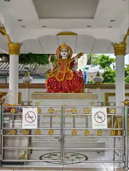 The Thepmonthian Temple, or the Hindu Samaj Association, is a Vaishnavite Brahmin temple located above Bharati College on Siripong Road, Samran Rat Subdistrict, Phra Nakhon District, Bangkok. It is near Benjamarat School under Royal Patronage, Suthat Thepwararam Ratchaworamahawihan Temple, and Sao Chingcha. The temple was built in 1925 as a sanctuary for Vishnu and Hindu deities, as well as a unifying place for the Indian community. Enter the school and take the elevator to the 3rd floor. Inside Thepmonthian Temple, there are several marble statues, with Vishnu and Goddess Lakshmi as the main deities, along with many other statues. There are prayer chants for blessings, and it is popular for people seeking love blessings.