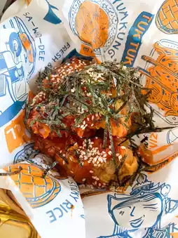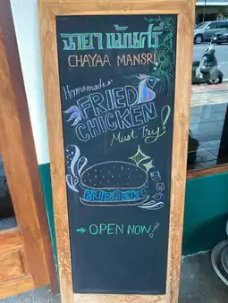 Chayaa Mansri Fried Chicken: The shop serves American-style fried chicken, fragrant with spices, juicy inside, and very crispy batter. Besides that, they also have burgers with homemade buns, salads, mashed potatoes, and pasta. Warning‼️ The chicken pieces here are huge. We ordered 6 pieces thinking they would be small, but they were actually huge. In the photo, they look like regular small pieces 🤣 When we saw the real ones, we could only wrap them to go because we couldn't finish them 😂