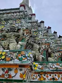 Wat Arun’s beauty is breathtaking at any time of day, but it truly shines during sunrise or golden hour. Its towering central prang (Khmer-style spire) is decorated with colorful porcelain tiles and seashells, shimmering as the light hits it. Up close, you’ll notice the incredible level of detail in every sculpture and mosaic — it’s like walking through a piece of art history.