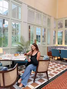 A beautiful glasshouse-style restaurant with high ceilings, warm mint green tones, 2 floors, comfortable seating, spacious area, and plenty of photo corners in every nook and cranny.