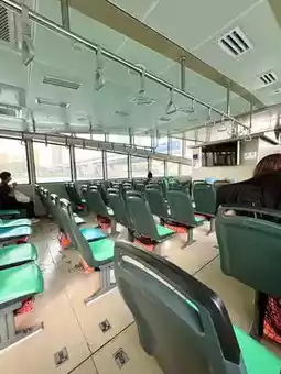 The cabin with green seats is clean and some seats have USB ports. Early morning around 7 AM is less crowded, making it a great time for photography.