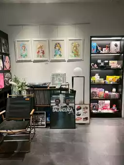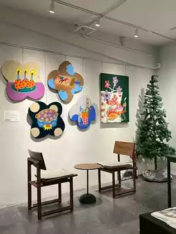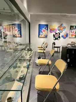 An underground cafe with a unique style and a chill atmosphere, featuring a pop art gallery corner and fantasy paintings.