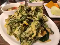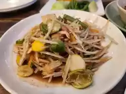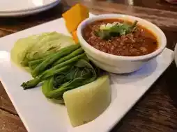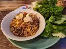 Recommended dishes to try are Tam Huen Lamphun (papaya salad), Pak Kood salad, Kaeng Khae Gai (Northern Thai curry with chicken), and Larb Muang, served with fresh vegetables. They are very delicious.