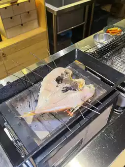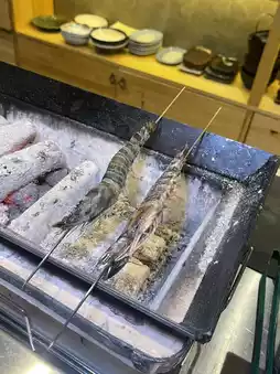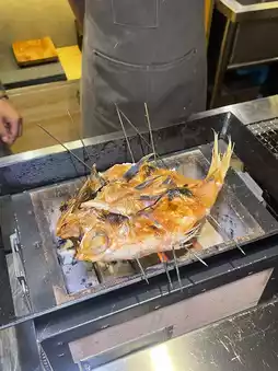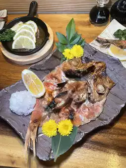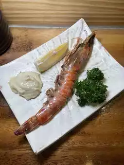 Grilled Amadai fish is fragrant with a slightly salty taste, enjoyed with lemon to balance the flavor—delicious. Grilled Kamasu fish is cooked just right, firm texture, great taste. Grilled shrimp served with mayo sauce and lemon. Slow-cooked grilled chicken and pork are favorites—super delicious. The chicken skin is crispy, the inside tender and juicy. The pork is very tender, served with onion sauce that pairs perfectly.