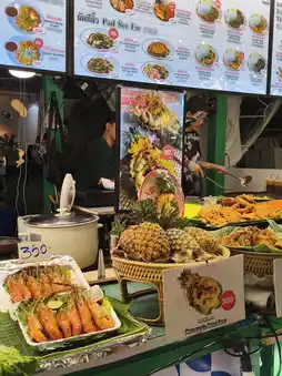 After shopping at Central World, we just wanted to take a walk, but as soon as we stepped out the door, we were greeted by a lively row of street food stalls, with flashing lights and irresistible aromas that completely drew us in. We decided to have dinner right there, enjoying Thai grilled skewers, shrimp cakes, Thai milk tea, and mango sticky rice. The prices were affordable and the food was incredibly satisfying.