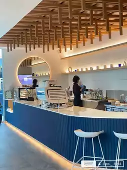 The cafe is decorated perfectly with blue and cream colors accented by wood, complemented by glass walls all around that let in natural light, making photos look amazing.