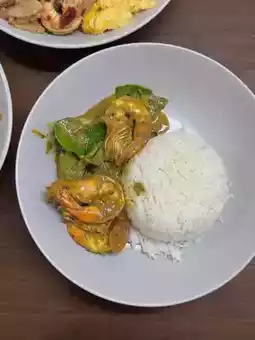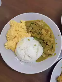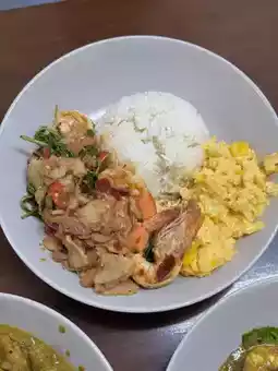 P'Korn's restaurant at Kasetsart University, Bangkhen is a favorite among Kasetsart students. It’s a made-to-order food place that I highly recommend trying. The taste is very delicious, and the portion size is generous and reasonable for the price. I like to order rice topped with Southern-style chili paste stir-fry, which is a very spicy and flavorful dish. The restaurant has both outdoor and air-conditioned seating. I went to branch 1, which is not far inside the alley and has convenient parking. It gets crowded around noon. This is a made-to-order restaurant that I definitely recommend.