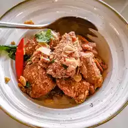 001 Mongolian Pork Ribs: Richly flavored pork ribs stir-fried in a special Mongolian sauce, coated with salted egg yolk, sprinkled with almonds and fragrant curry leaves. A special menu exclusive to JUMBO Thailand only.