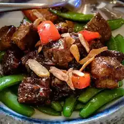 002 Australian Wagyu Beef Stir-fried with Honey Black Pepper Sauce: Diced wagyu beef stir-fried in a sweet and spicy sauce, enhanced with sweet snow peas. A special menu from JUMBO China.