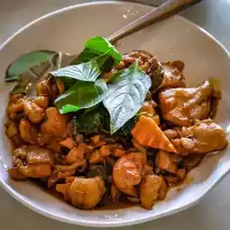 005 Three-Flavored Chicken: A famous Taiwanese dish seasoned with “three cups” of soy sauce, Chinese rice wine, and sesame oil, combined with chicken, bamboo shoots, and basil leaves, served in a clay pot. A special menu from JUMBO Taiwan.