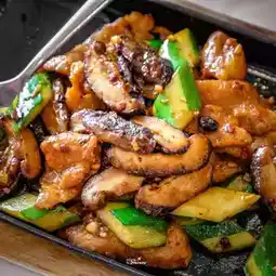 004 Grilled Pork Neck with Special Chili Black Bean Sauce: Juicy grilled pork neck stir-fried with spicy black bean sauce, fresh shiitake mushrooms, and Japanese cucumber, served on a hot pan. A special menu from JUMBO Taiwan.