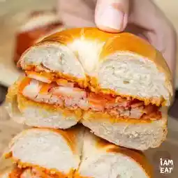 Crab Stick Romesco & Ebiko 165.- Bagel with crab stick, shrimp roe, and a fragrant, rich sauce. The bagel is very chewy and soft, made just right—not too tough, perfect for enjoyable chewing.
