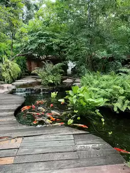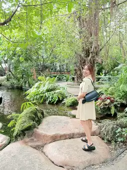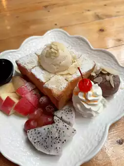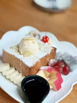 a cafe located not far from Don Mueang Airport. Here at Foresta Cafe, you will find the natural shade of various trees, a koi pond, a turtle pond, and many seating areas to choose from, both outdoor and indoor. We chose to sit inside. The menu here is very diverse, including both savory and sweet dishes, as well as tea and coffee drinks—everything is available. This meal, we chose to have desserts. The dishes we ordered were black sesame rice balls in ginger syrup and honey toast with chocolate and vanilla ice cream. The food tastes really good. The black sesame rice balls in ginger syrup are well made with a mellow flavor. The honey toast took about 20 minutes to prepare; the outside is crispy, and the inside is soft. It’s delicious.